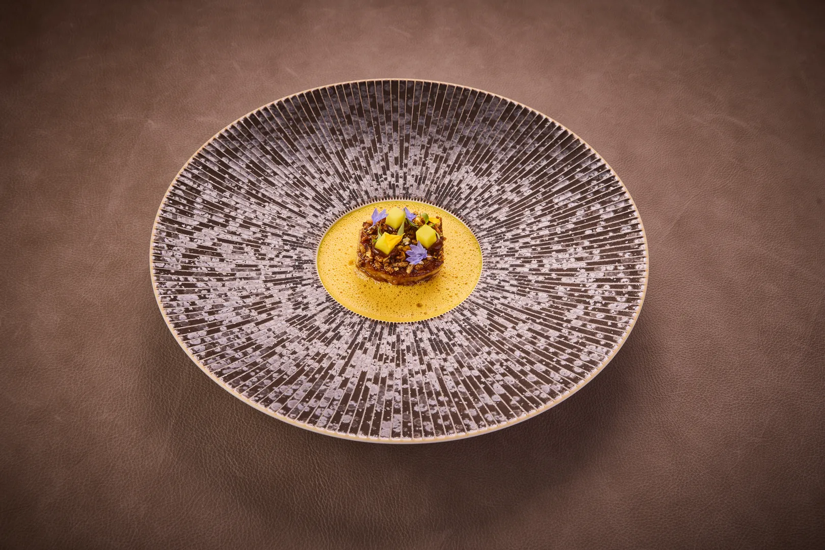Teller mit Gerichten, Foie Gras – Tamarinde – Grüne Mango – Vadouvan