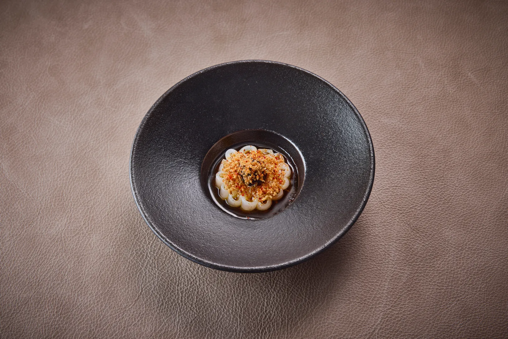Teller mit Gericht, Tintenfisch – schwarzer Knoblauch – gegrillte Zitrone