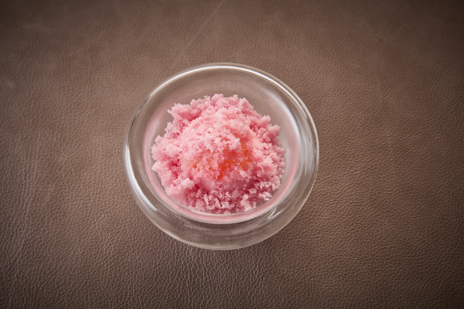 Teller mit Gerichten, Koji – Blüten Sorbet – Birne – Yuzu
