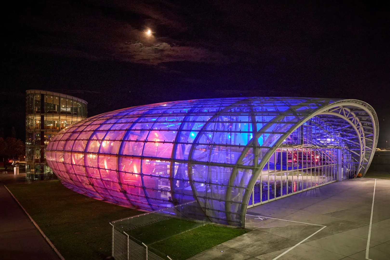 • Außenansicht des Hangar-7 bei Sonnenuntergang