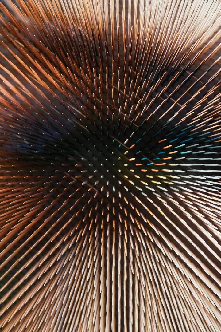 Besonders bekannt ist der Künstler für seine dreidimensionalen Porträts, die aus modularen Elementen wie tausenden farbigen Holzstiften aufgebaut sind. Der Weg zu dieser charakteristischen Formensprache war das Ergebnis eines langen Reduktionsprozesses: von frühen Heiligenbildern und Collagen hin zum einzelnen Punkt als grundlegender bildnerischer Einheit. Der einzelne Punkt als Ursprung; wie ein Urknall, verweist auf die Entstehung aller Dinge aus einem kleinen, aber kraftvollen Funken.