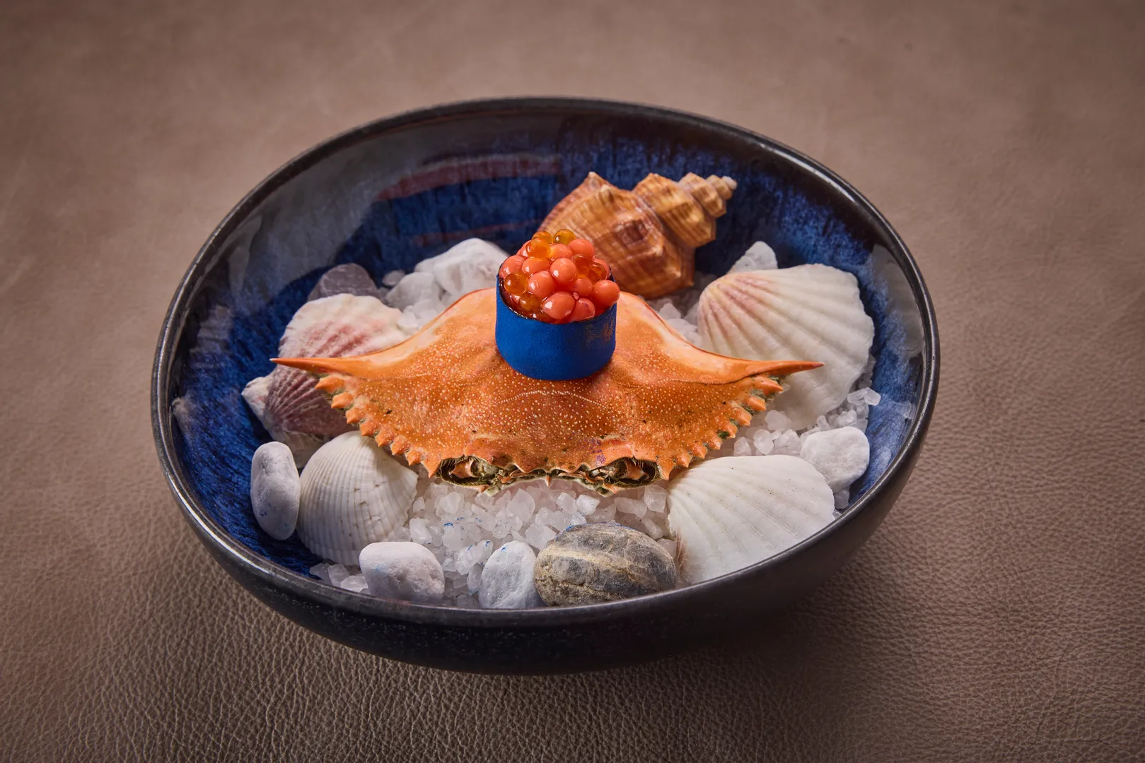 Plate with dish, Blue crab – Spirulina – Nori – Trout caviar