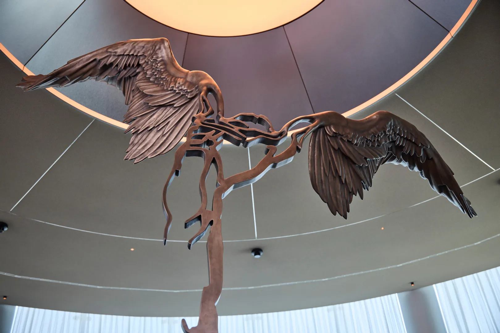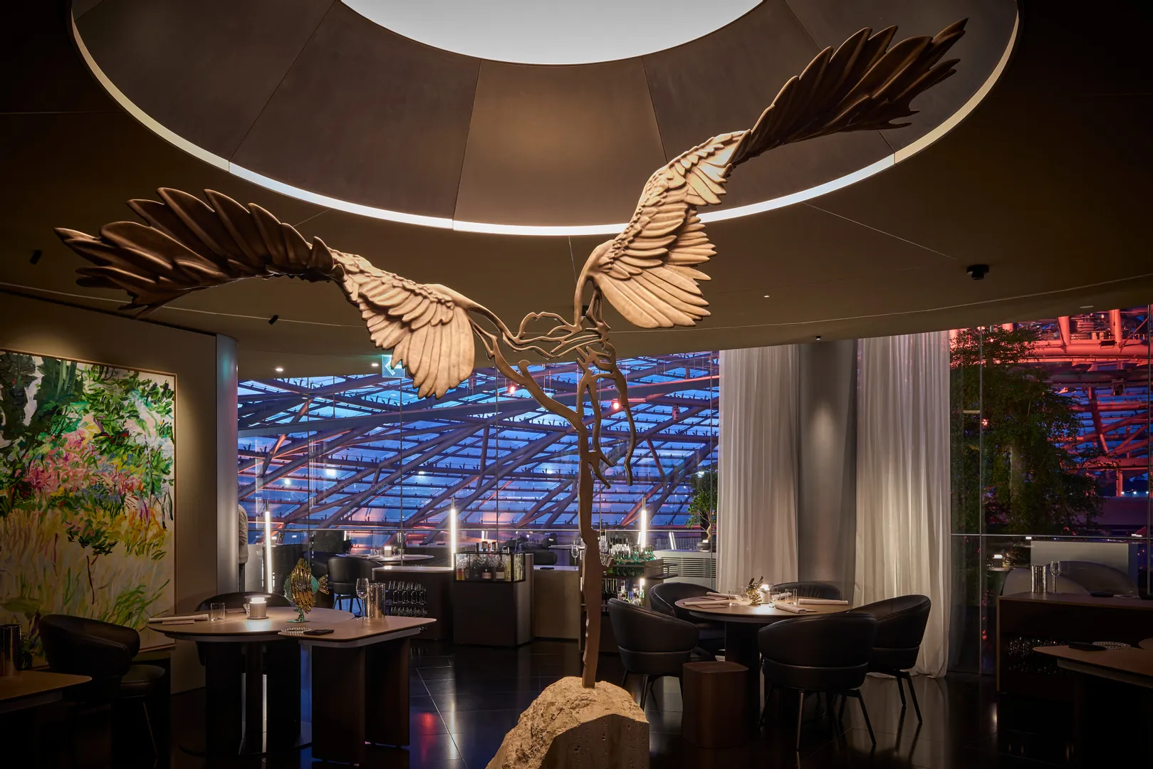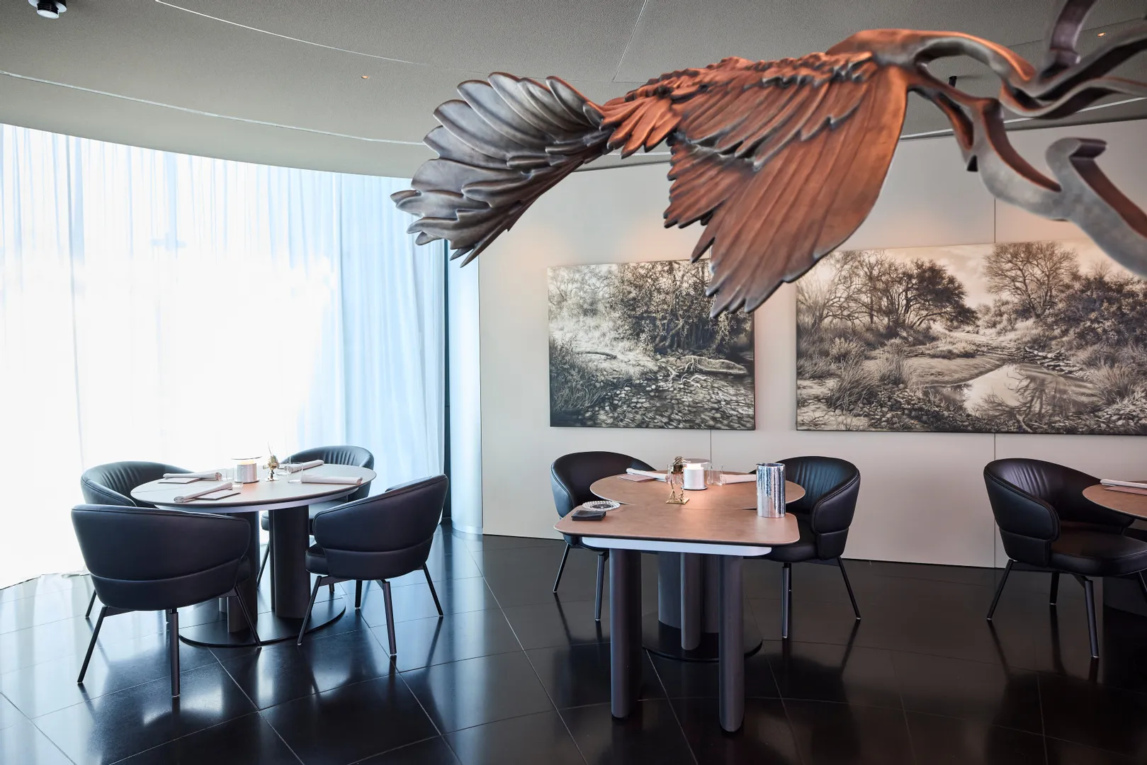 • inside area of Restaurant Ikarus with Ikarus sculpture and painting