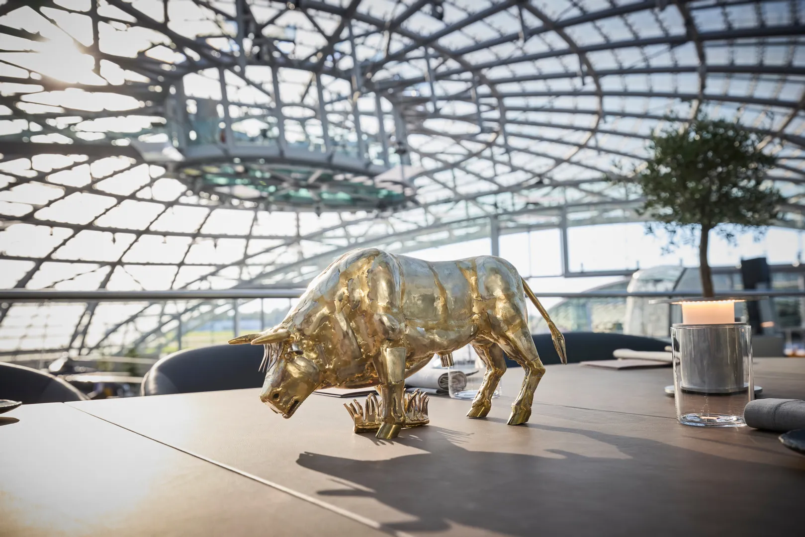 Restaurant Ikarus SculptureSet table at Restaurant Ikarus terrace with view of the exhibition inside area of Restaurant Ikarus