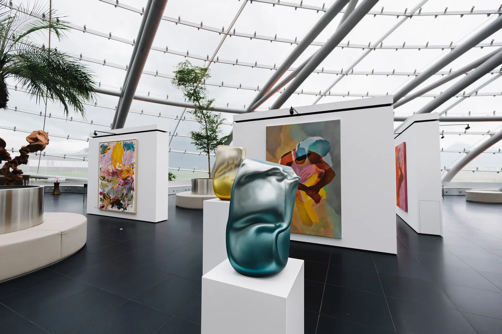 • Interior view of Hangar-7 showing its glass-and-steel architecture, seating arrangements and plants