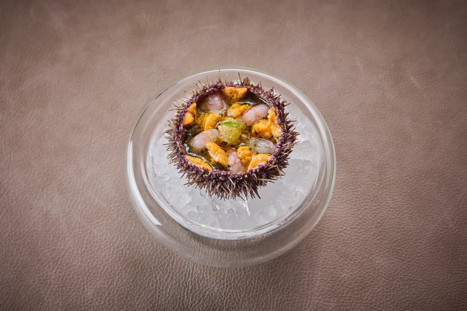 Teller mit Gericht, Seeigel – Eismeergarnele – Fingerlimette – grüne Erdbeere